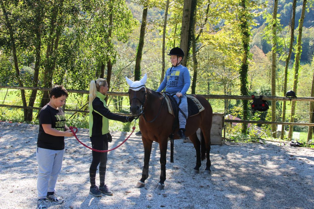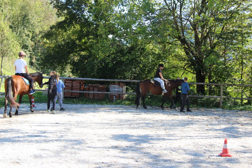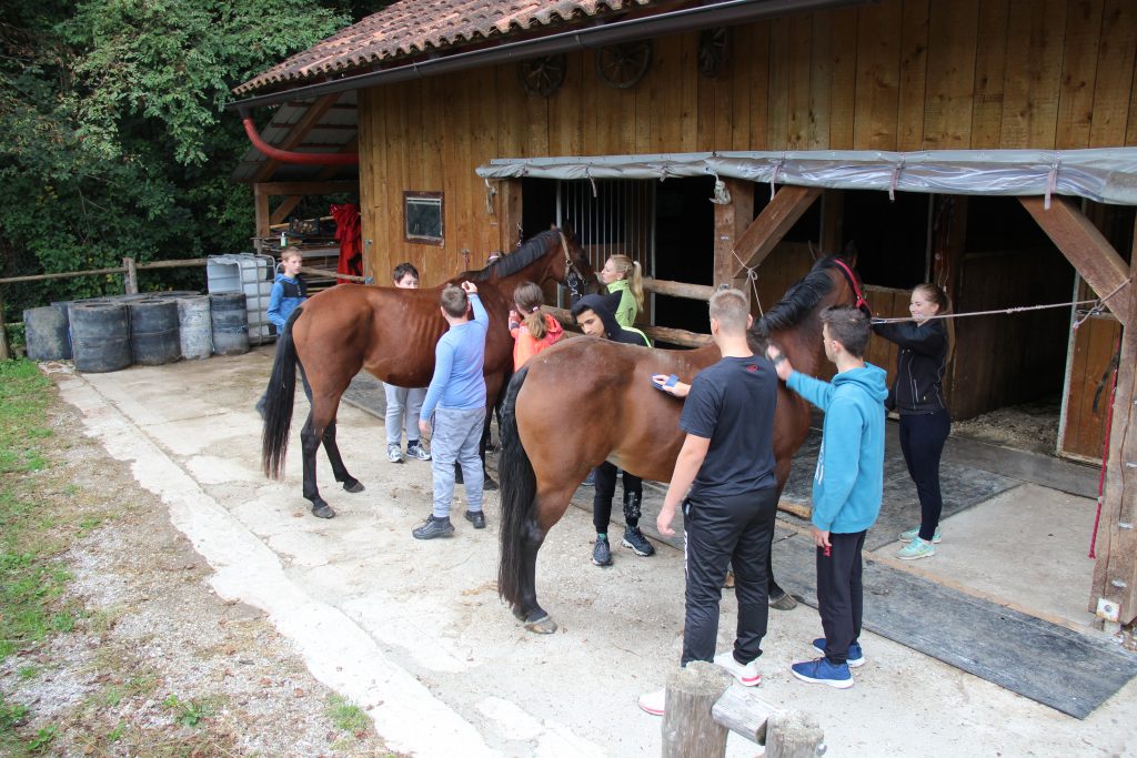 V sredo, 30.9.2020, smo izvedli športni dan. Podali smo se na Pelance, kjer nas je prijazno sprejela Nejka. Seznanila nas je z dvema kobilama – Karin in Mary. Najprej smo ju skrbno skrtačili in osedlali. Po krepki malici smo se razdelili v dve skupini. Prva skupina se je podala na Mengore, kjer pa so sončni žarki sramežljivo kukali skozi meglo. Učenci druge skupine pa so izmenično jahali in vodili konje. Sledila je menjava skupin. Drugo skupino je pozdravil na Mengorah prelep razgled na Krn in okoliške hribe. Prva skupina pa je uživala v jahanju. Močno smo zaploskali učencu, ki je premagal strah in zajahal konja.