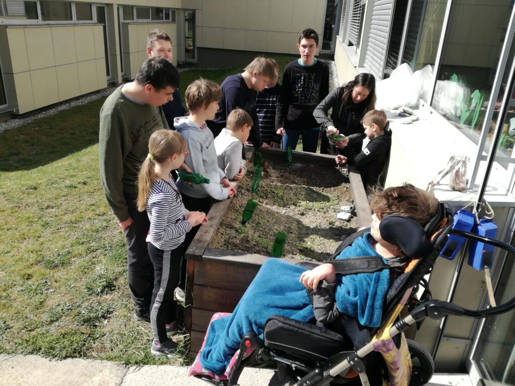 Ker pa dobro vemo, da vodo za življenje potrebujejo tudi rastline, smo izdelali namakalni sistem za našo visoko gredo, jo ob trenutni suši dobro zalili in vanjo namestili namakalni sistem.