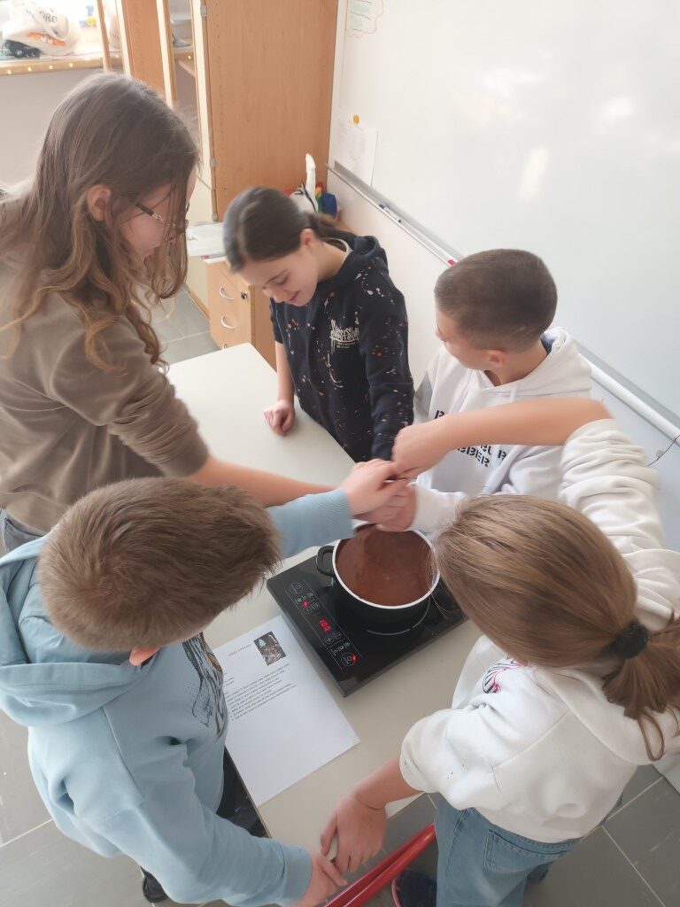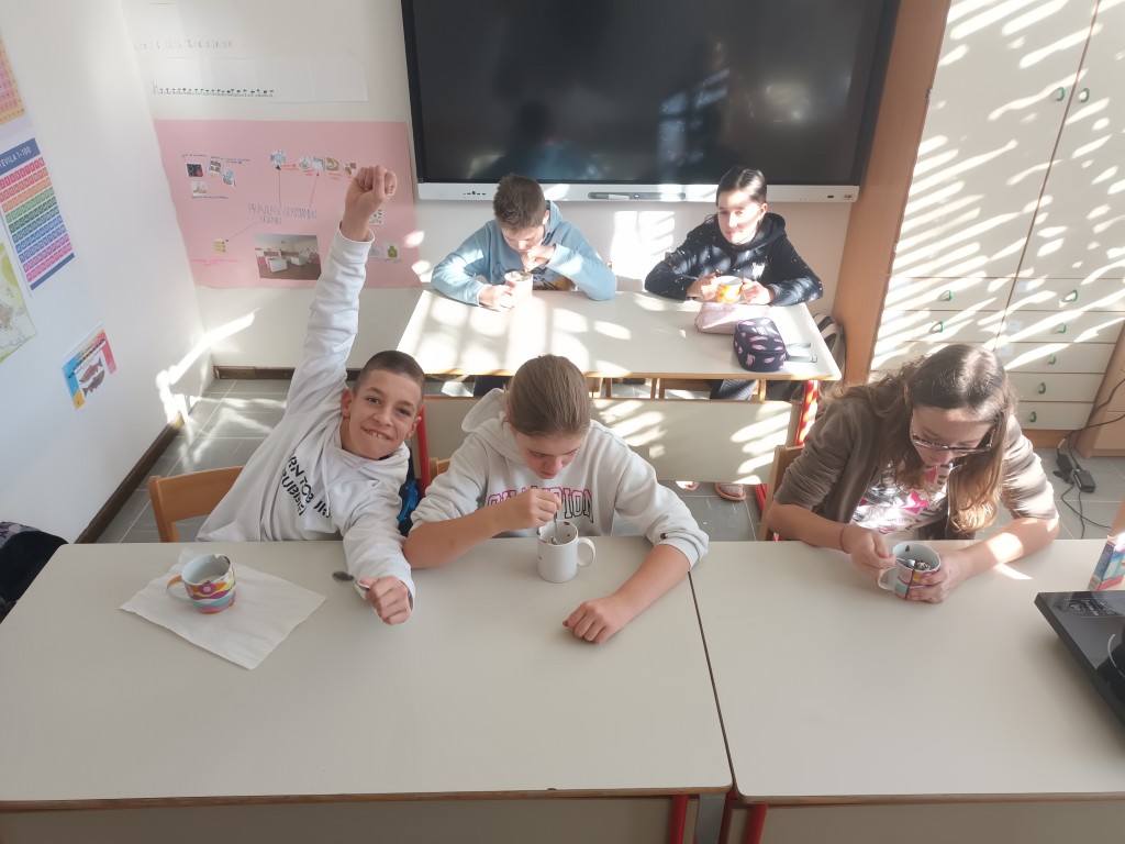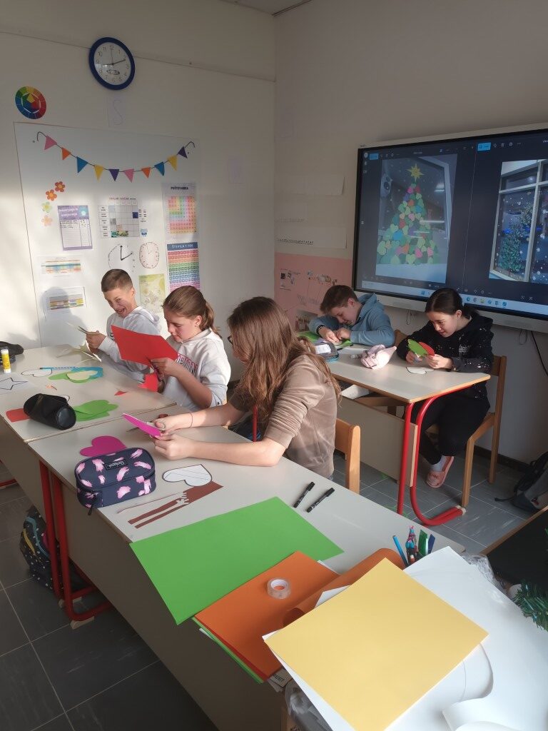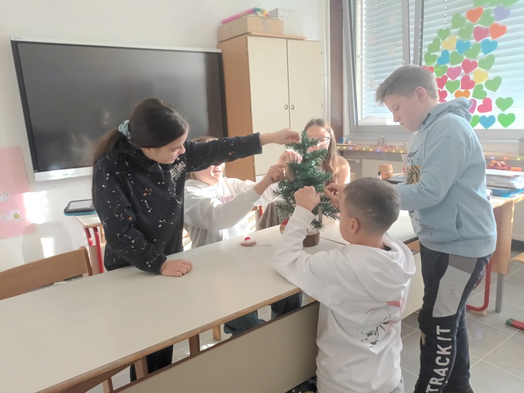 Na prvi decembrski dan smo se učenci 6. in 7.h odločili, da je ravno pravi čas, da izvedemo tehniški dan – novoletna dekoracija. Najprej smo se lotili okraševanja učilnice. Iz papirja smo izdelali smreko, snežinke in vsak svojega snežaka ter vse izdelke prilepili na okna. Postavili smo tudi smreko in nanjo dali izdelane okraske. Ker smo menili, da brez lučk med prazniki ne gre, smo jih namestili po učilnici. Od vsega dela smo postali že pošteno lačni, zato smo odšli v trgovino in kupili sestavine za pripravo vroče čokolade. S skupnimi močmi smo pripravili slastni praznični napitek.