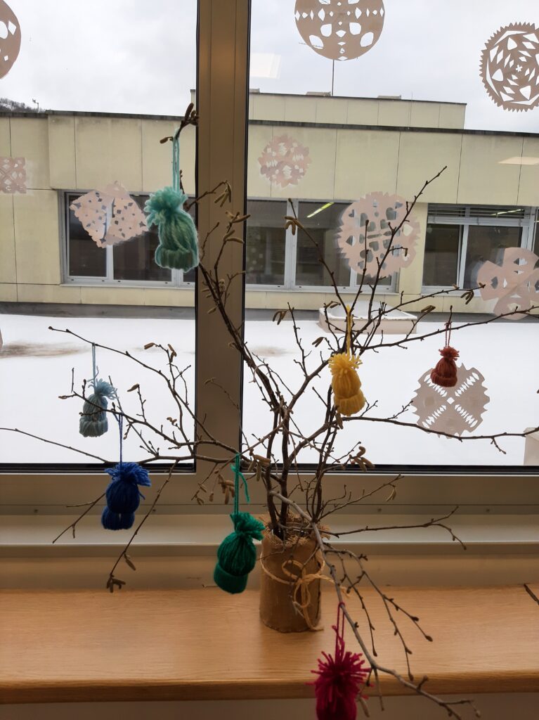 Postavili smo tudi naše malo drevesce, na katerega smo obesili majhne kapice, ki smo jih prav tako izdelali sami. Seveda smo pripravili tudi darila za naše domače.