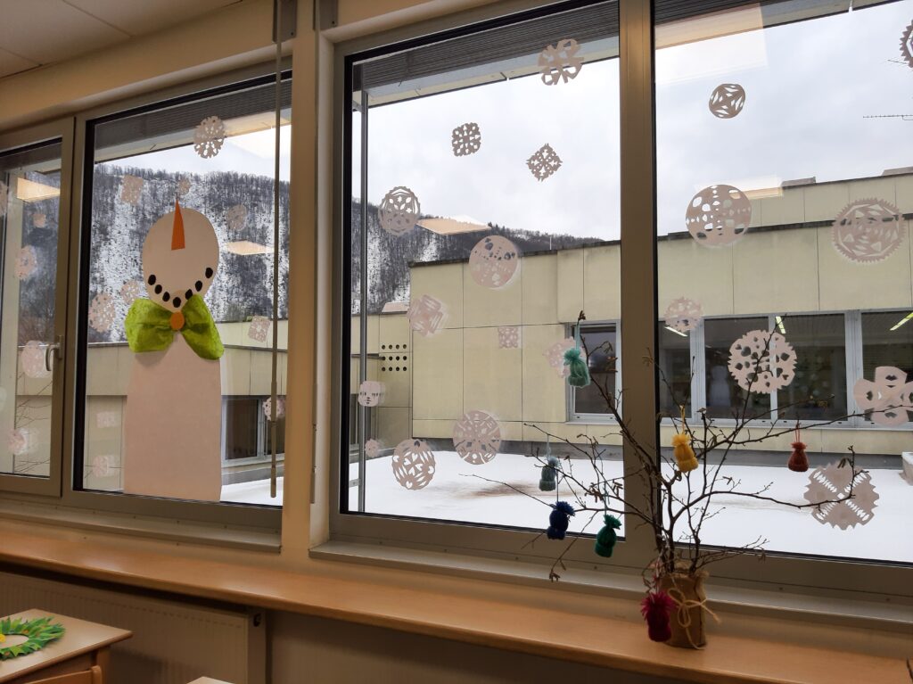 V začetku so bile naše roke nekoliko okorne, ampak vaja dela mojstra in kmalu so pričele nastajati čipkaste snežinke različnih oblik in velikosti. Vsem pa je bilo skupno eno: so najlepše, ker smo jih naredili sami. S snežinkami smo okrasili okna našega razreda. Kadar nas ni v razredu, na snežinke pazi prijazni snežak Lojze.