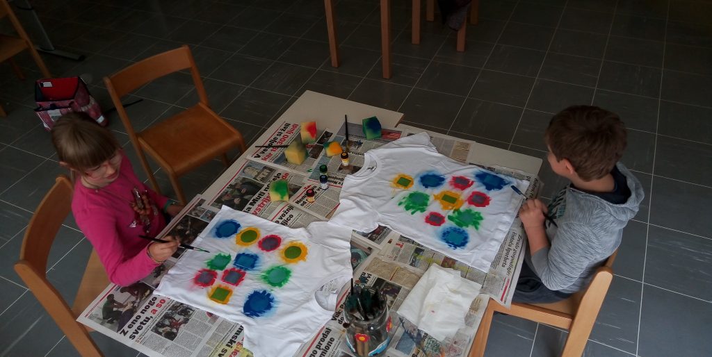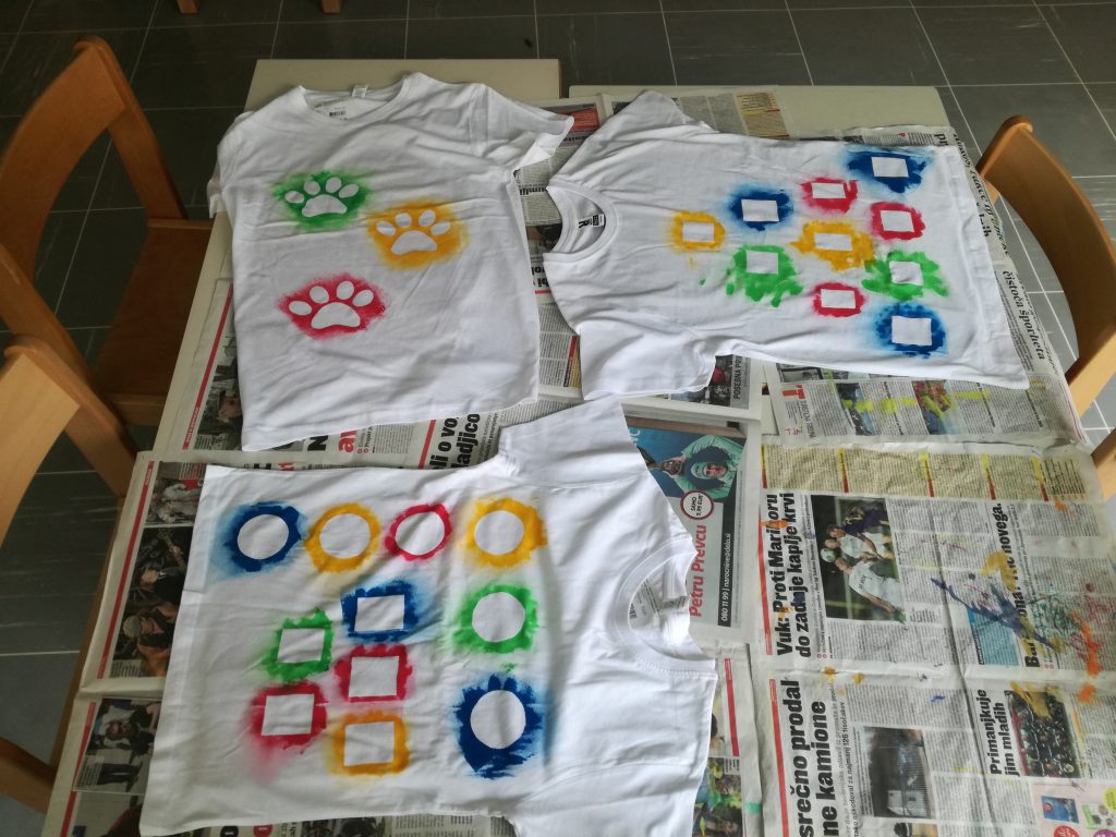 Najprej smo si izbrali motive za na majico in določili, kako bo majica izgledala. Nato smo barvo za tekstil nanesli okoli motiva na nalepki. Počakali smo, da se majica posuši in odlepili nalepko. In nastale so prav čudovite majice!
