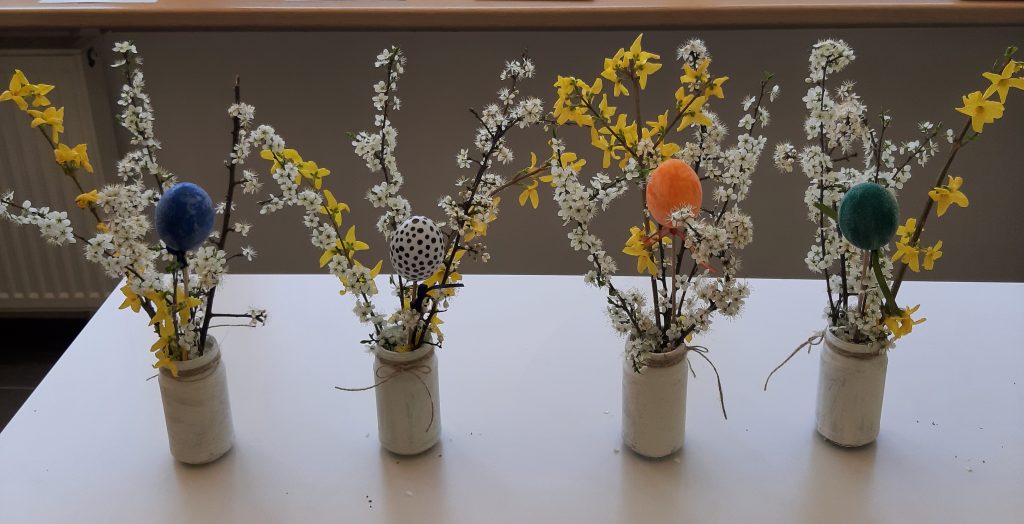 Učenci 3. in 4. h razreda smo v tem tednu izvedli tehniški dan. Ker se bliža Velika noč smo barvali pirhe in izdelali vazice, v katere smo oblikovali naše velikonočne dekoracije. Pirhe smo tudi narisali in se pozabavali z novo tehniko – slikanje s soljo. Pri ustvarjanju smo se zelo zabavali. Izdelke smo odnesli domov, da nam bodo krasili domove v teh prazničnih dneh. Vsem pa želimo lepe praznike in veliko slastnih pirhov J .