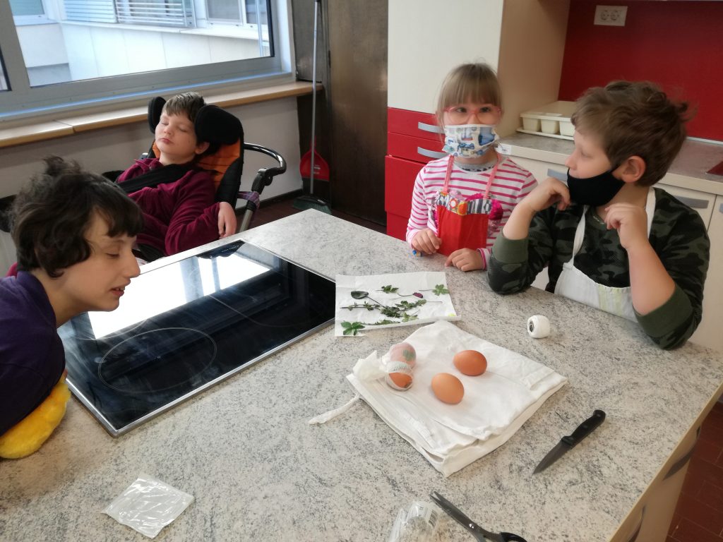 Najprej smo v sklopu delovne vzgoje pripravljali pirhe. Na jajca smo namestili različne pomladne rastline, jih dobro ovili z gazo in jih skuhali v čebulnih olupkih. S končnim izdelkom smo zadovoljni, bomo pa potrebovali še nekaj vaje.
