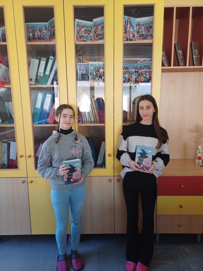 Na spodnji fotografiji sta naši odlični tekmovalki: na desni Lana Rutar Jezeršek, na levi pa Eda Mežnar, v rokah pa imata roman Modri otok, tako da ga boste v knjižnici lažje našli.
