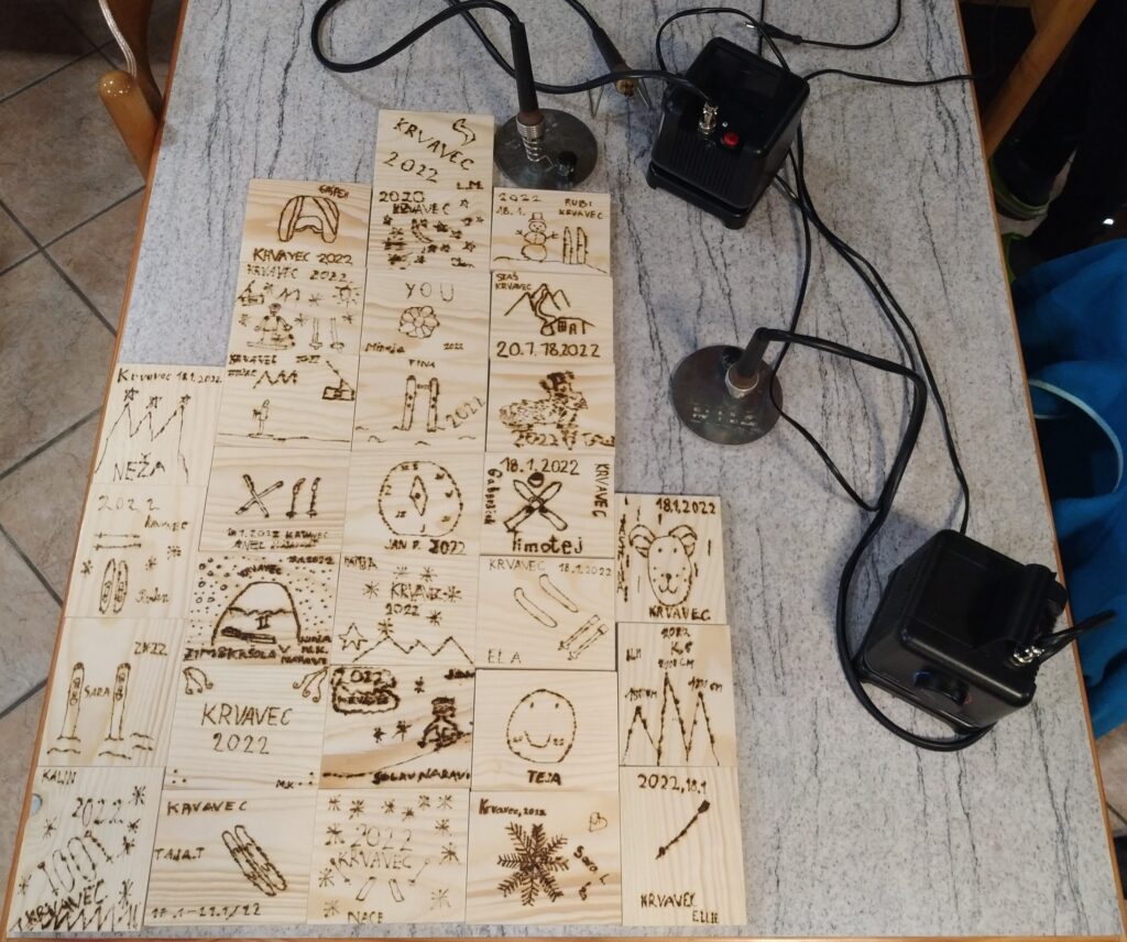 Že včeraj so učenci začeli ustvarjati s pirografi. V les so užigali vsak svoj motiv. Nastali so spominki na šolo v naravi.