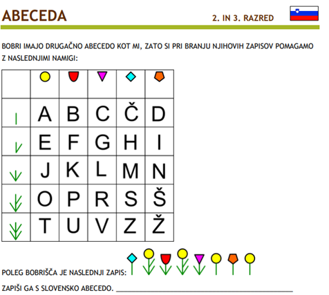 V tednu med 14.11. in 18.11.2022 pa so se učenci preizkusili v reševanju nalog, ki temeljijo na računalniškem razmišljanju. Računalnik predstavlja vir zanimivih logičnih problemov, zato je reševanje le-teh zanimivo in zabavno. Drugošolci in tretješolci so naloge reševali na papir, saj mnogi od njih še niso vešči rokovanja z računalniško miško. V nalogah so nastopali bobrčki. Eno izmed nalog si lahko ogledate tudi vi:
