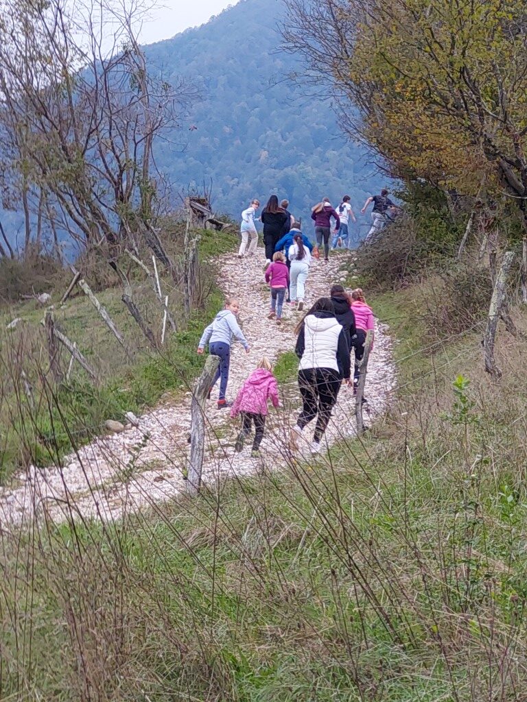 V torek, 15. 10., smo učenci in učitelji na PŠIUOPP končno dočakali dan brez dežja, kar je pomenilo, da se lahko odpravimo na že dolgo pričakovani športni dan – pohod do cerkvice sv. Marka nad Poljubinjem. Na pot smo krenili polni energije in zagona. Odpravili smo se skozi mesto Tolmin proti mostu čez Tolminko, od tam pa zavili proti vasi Žabče. Iz Žabč smo se povzpeli po strmi cesti do cerkvice sv. Marka, kjer smo se malce odpočili, se odžejali in naredili nekaj fotografij. Sledil je najzabavnejši del našega pohoda, saj smo pot nadaljevali proti igralom na Kuku. Tu smo najprej pomalicali, potem pa čas izkoristili za igro. Vendar vsega lepega je enkrat konec, kmalu je bil spet čas za hojo.