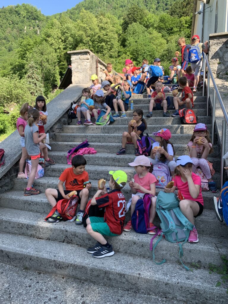 Lačni in žejni smo prisopihali do stopnic pred cerkvijo, se nanje posedli in sledila je….malica, seveda. Vsem so teknili sendviči, še bolj slastni pa so bili priboljški, ki so nam jih v nahrbtnike dali starši. Po krajšem počitku smo pot nadaljevali po cesti skozi Zatolmin.