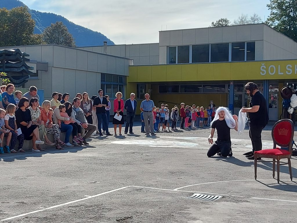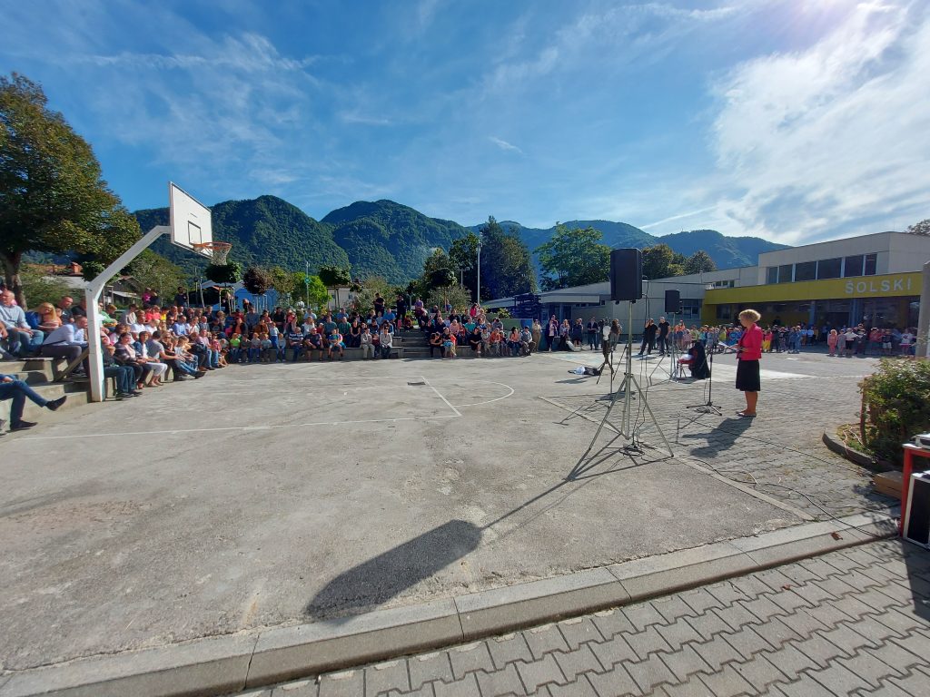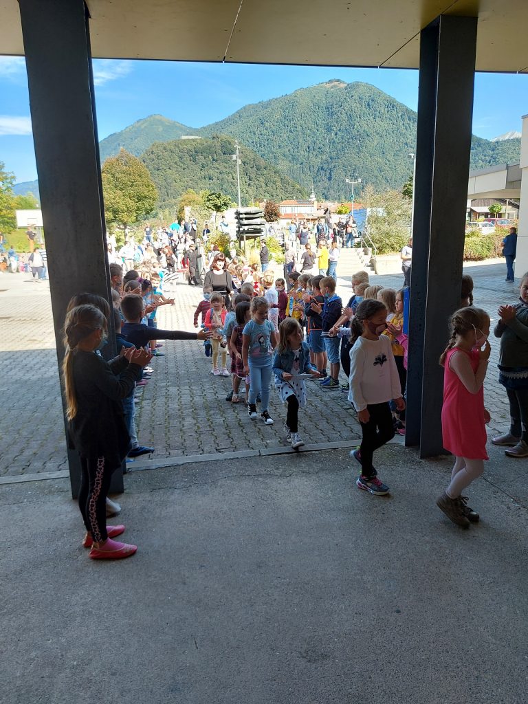 Ob 9. uri so se v spremstvu staršev zbrali v avli pred šolo. Pripravili smo jim kratek kulturni program, na katerega smo povabili tudi župana Občine Tolmin, Uroša Brežana, ter policista Petra Čeplaka. Pridružil se nam je tudi svetovalec za družbene dejavnosti Matej Kavčič.
