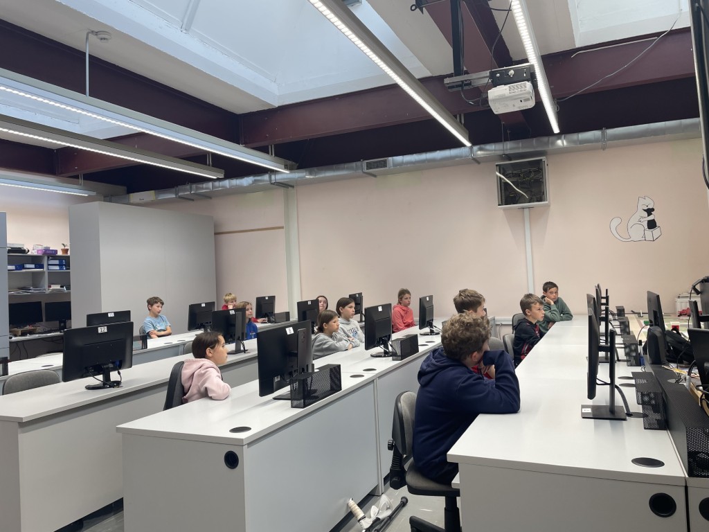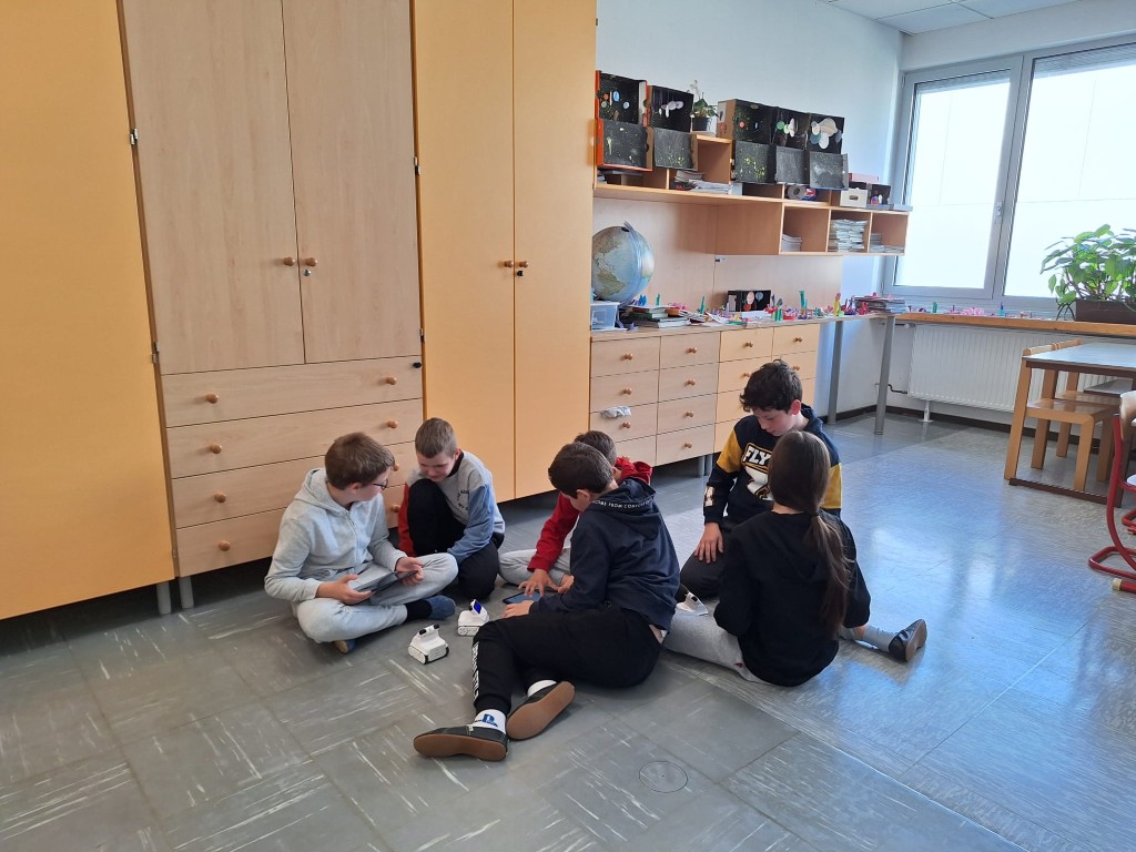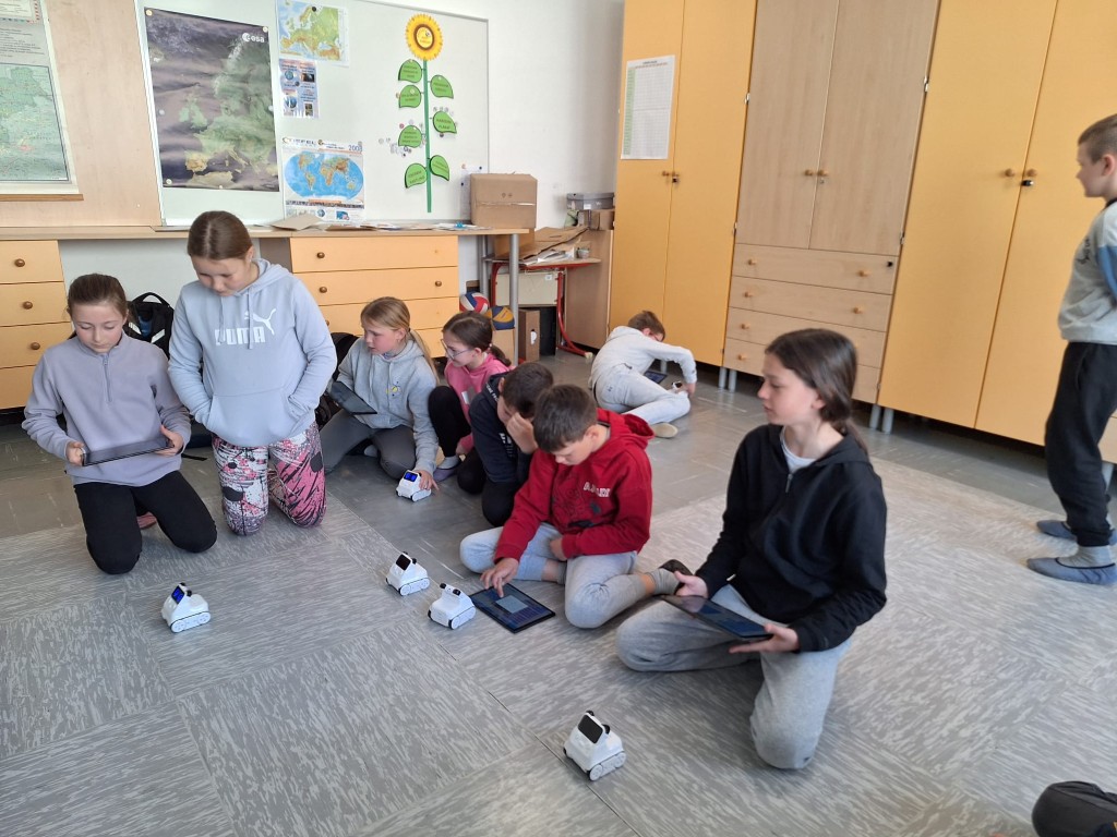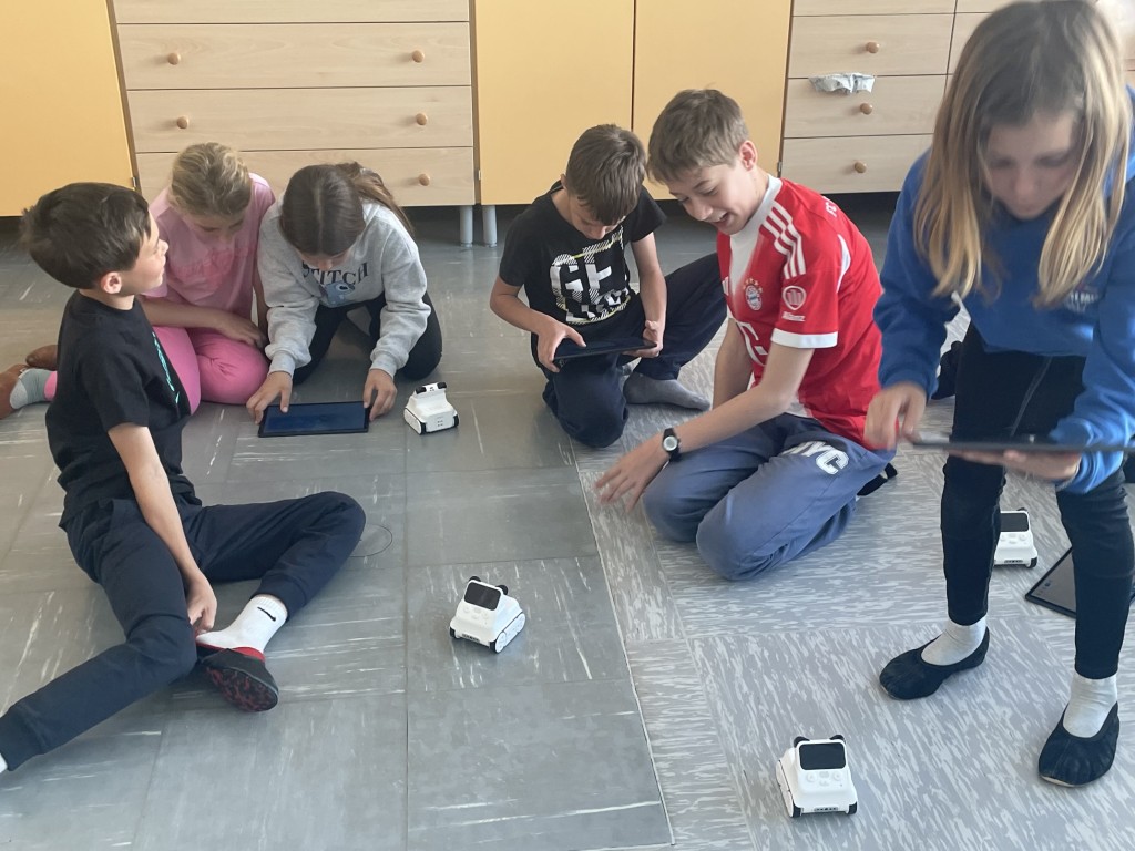V računalniški učilnici smo preizkusili VR očala in igrali smo igro, kjer smo streljali male vesoljske pošasti. V razredu pa smo programirali robotke s pomočjo aplikacije mBlock. Ko je bil čas za malico, smo namesto v razredu jedli v veliki jedilnici, kar je bilo za nas prvič. Po malici smo se zamenjali tako, da sta skupini zamenjali dejavnost.