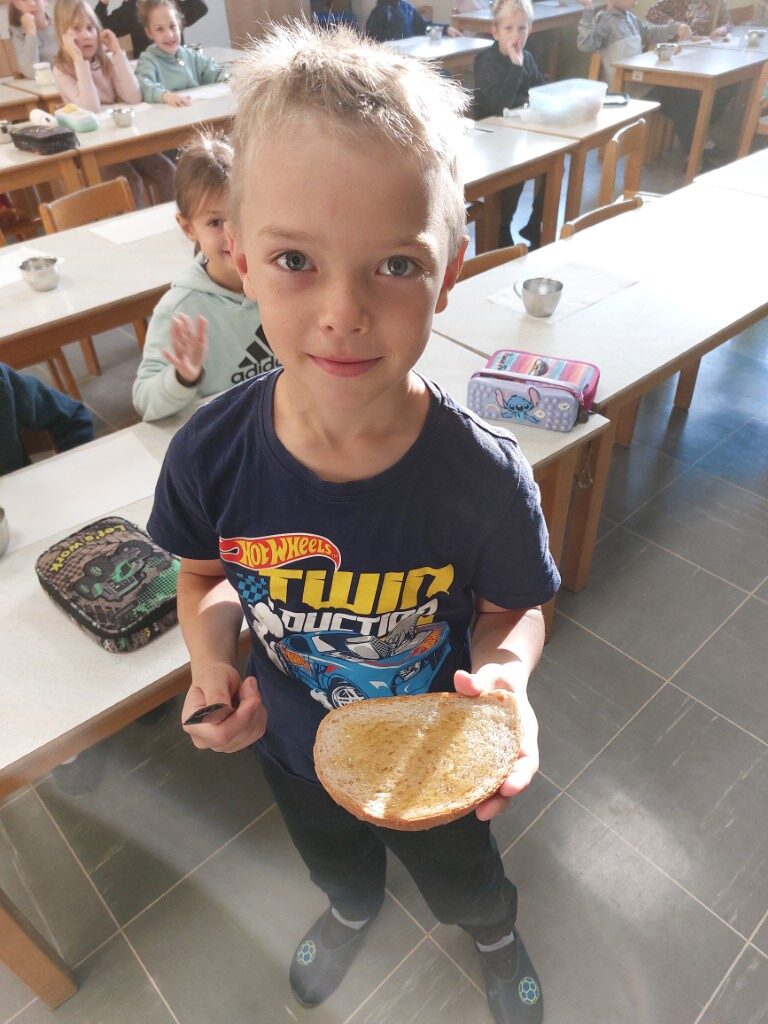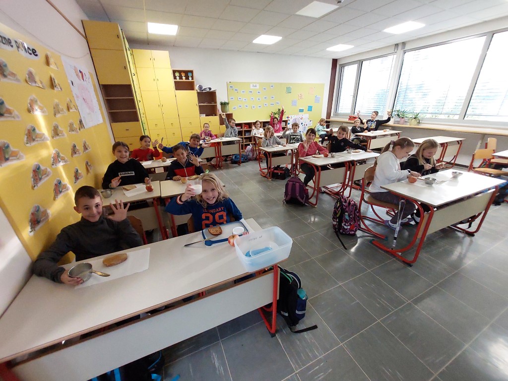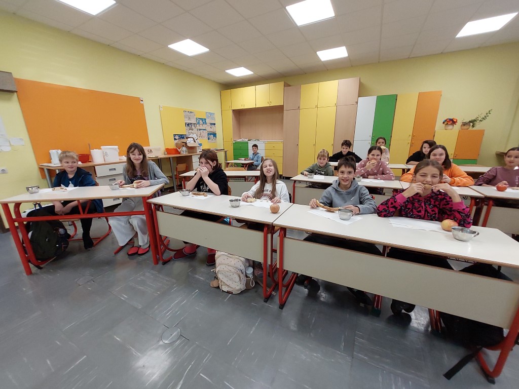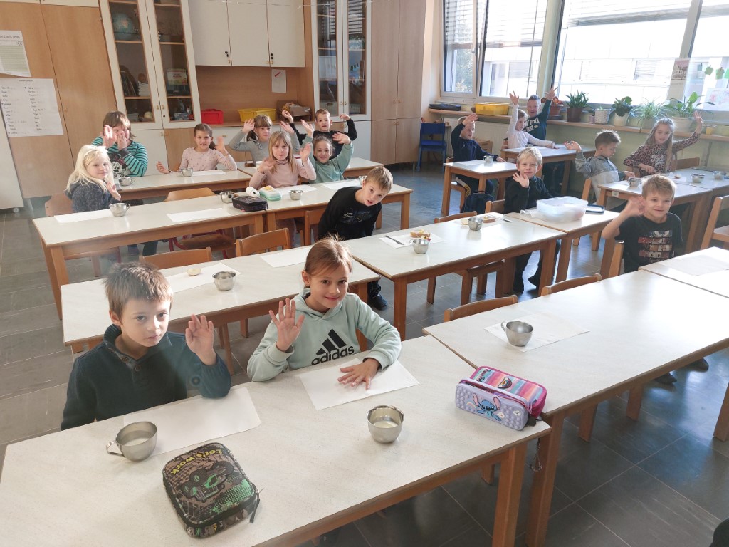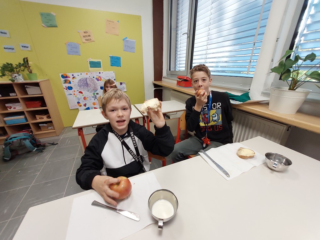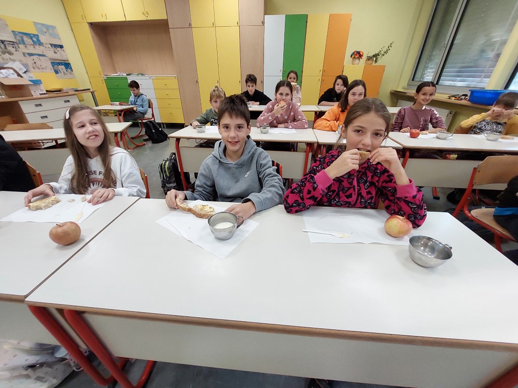 Učenci so z veseljem na črni kruh namazali slastni med in maslo ter si zraven postregli še mleko in jabolko.
