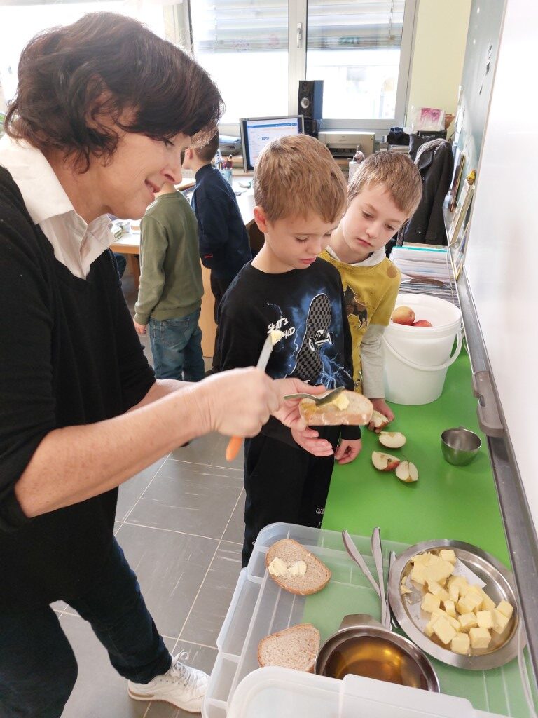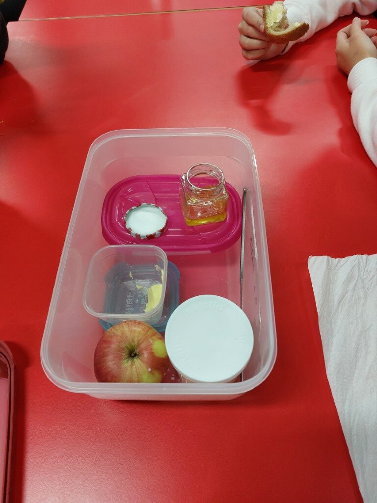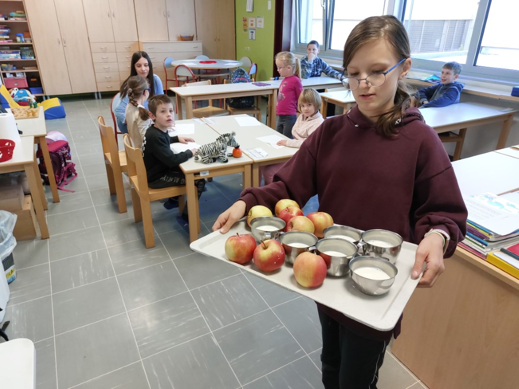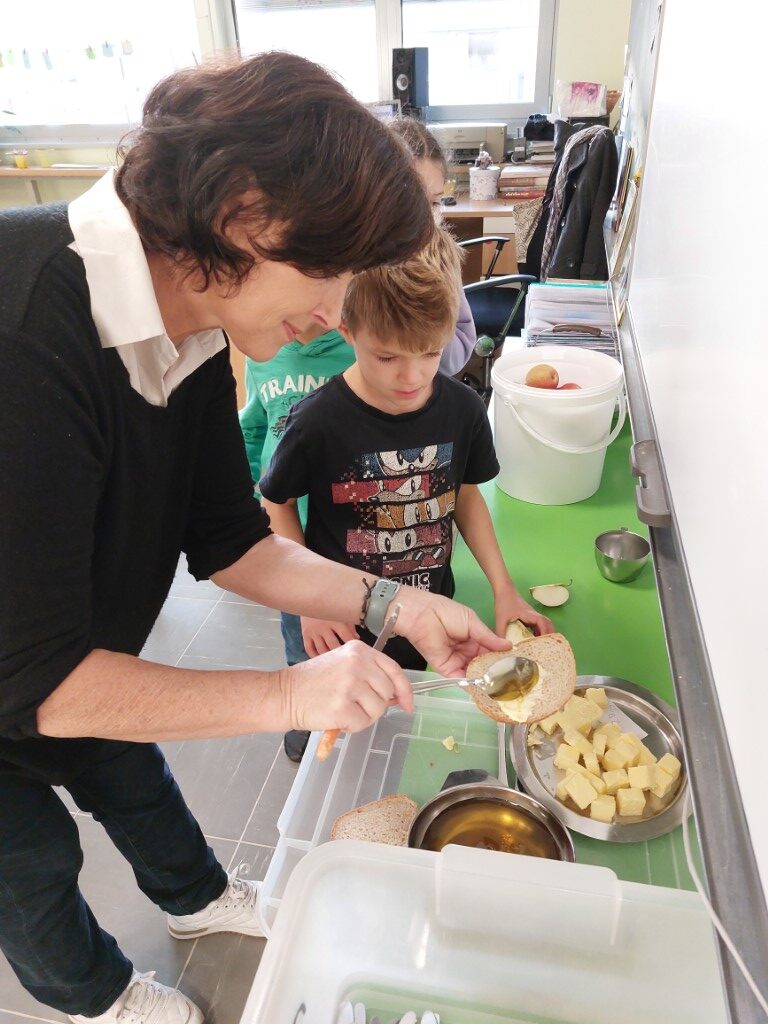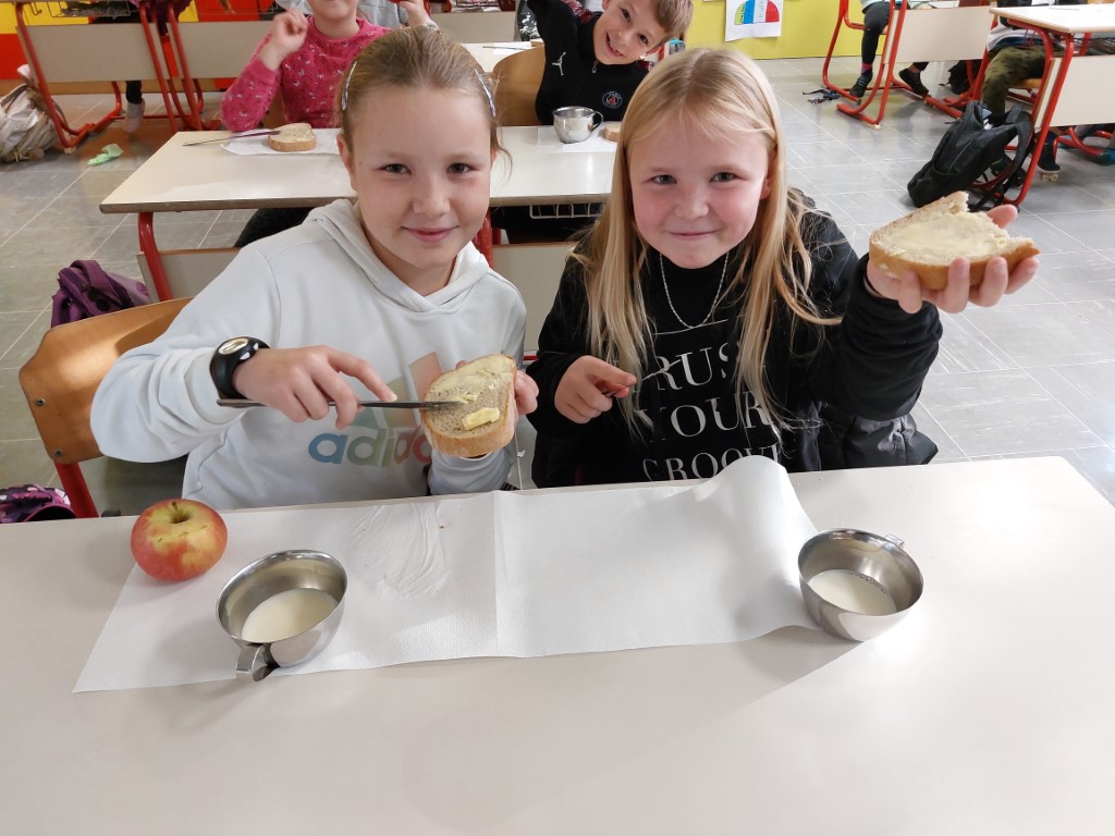 Učenci so z veseljem na črni kruh namazali slastni med in maslo ter si zraven postregli še mleko in jabolko.