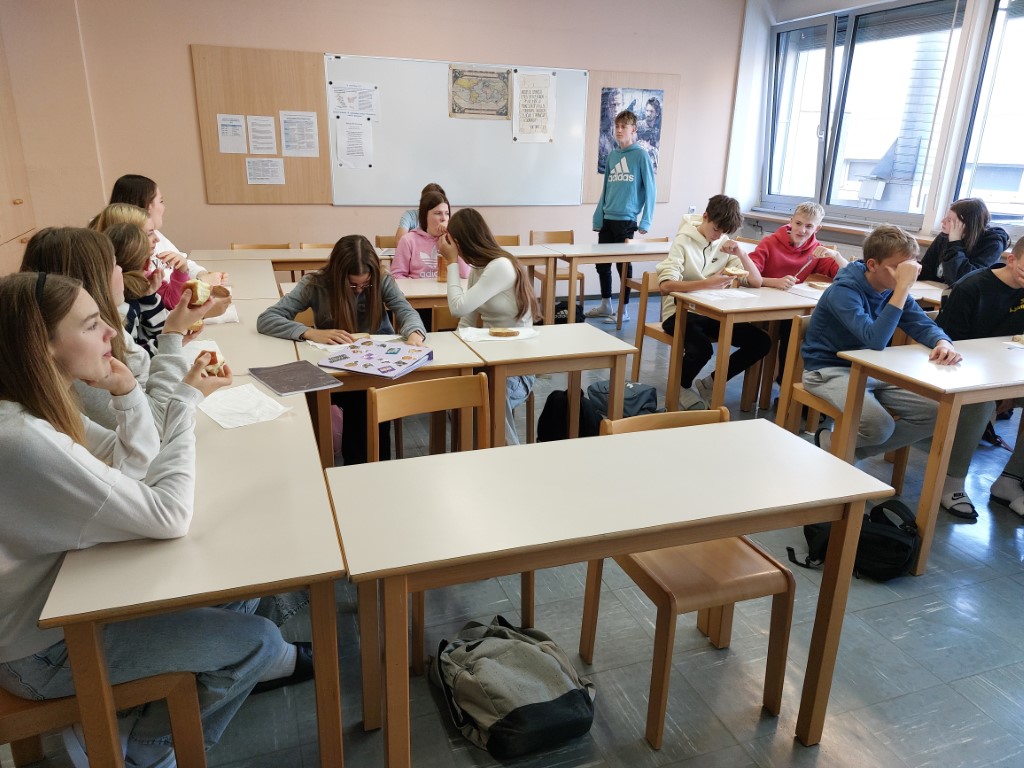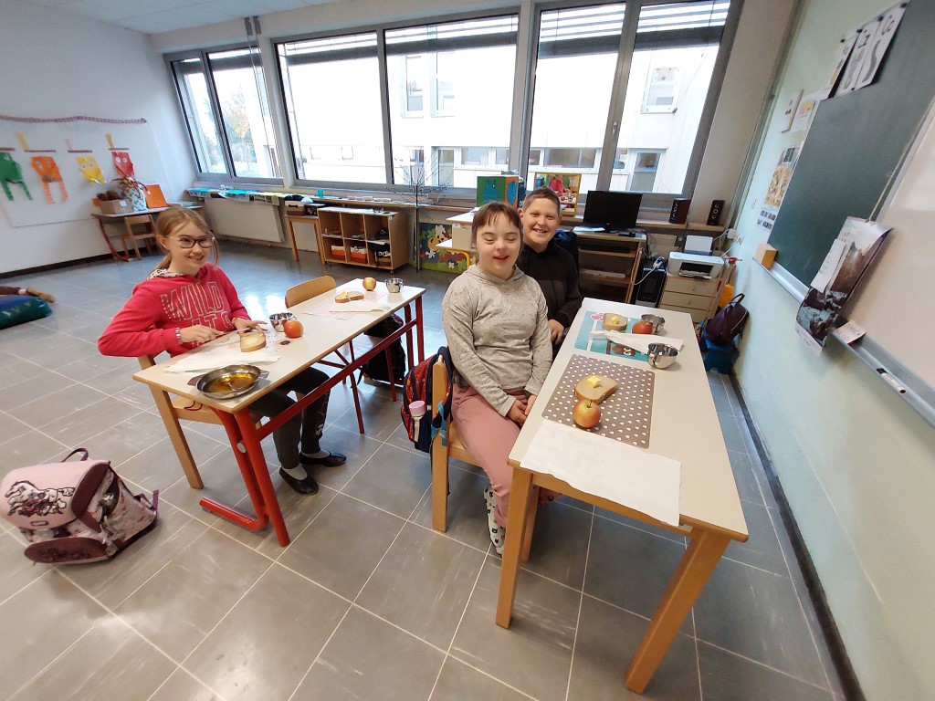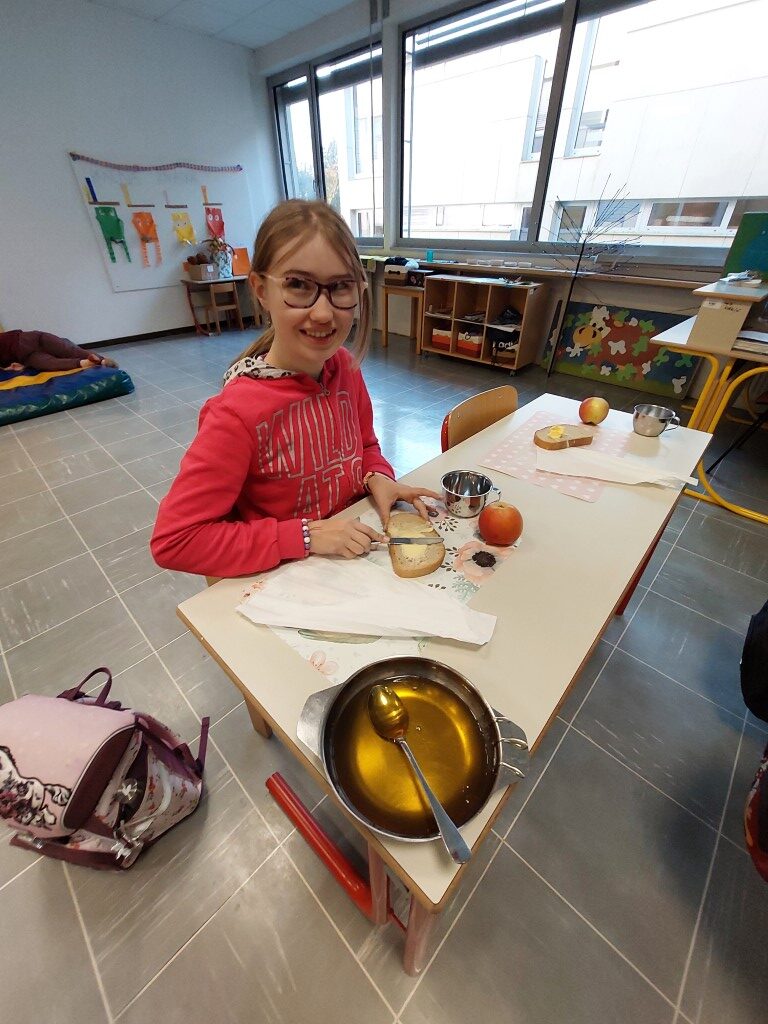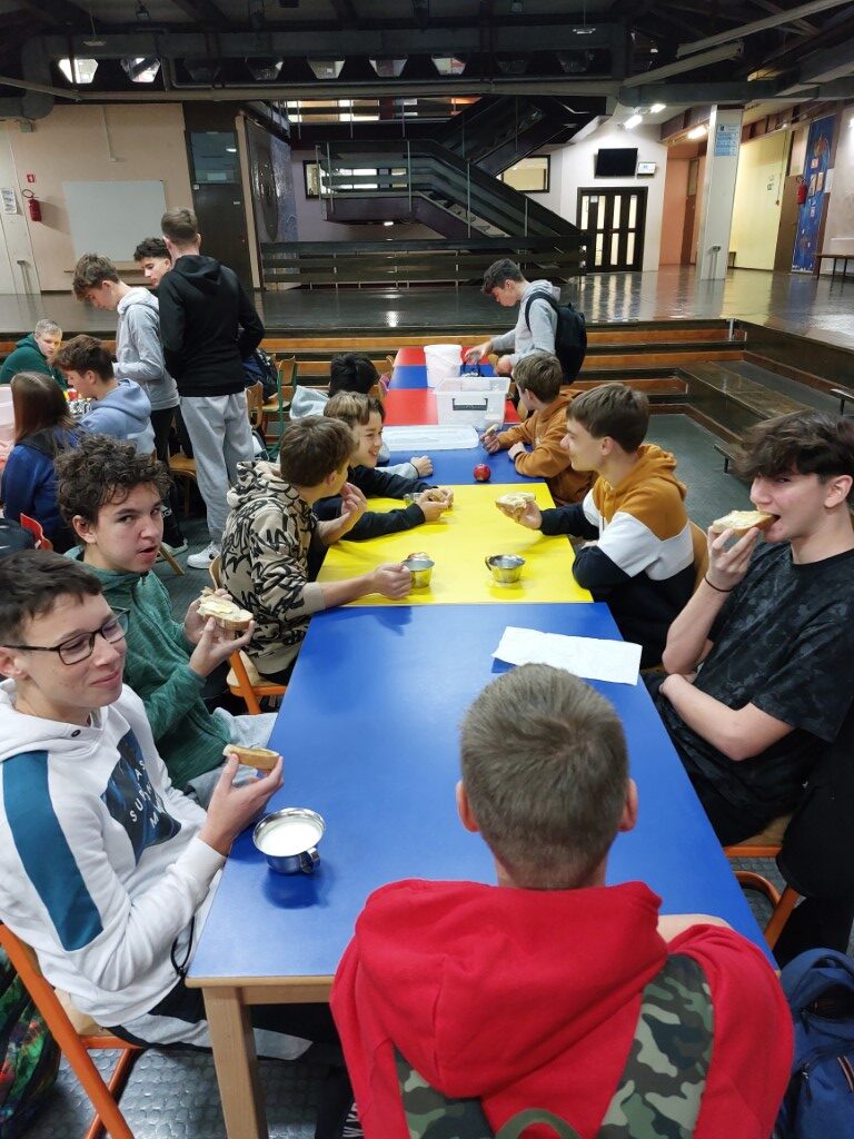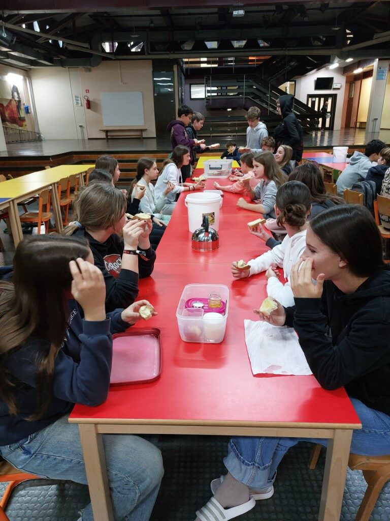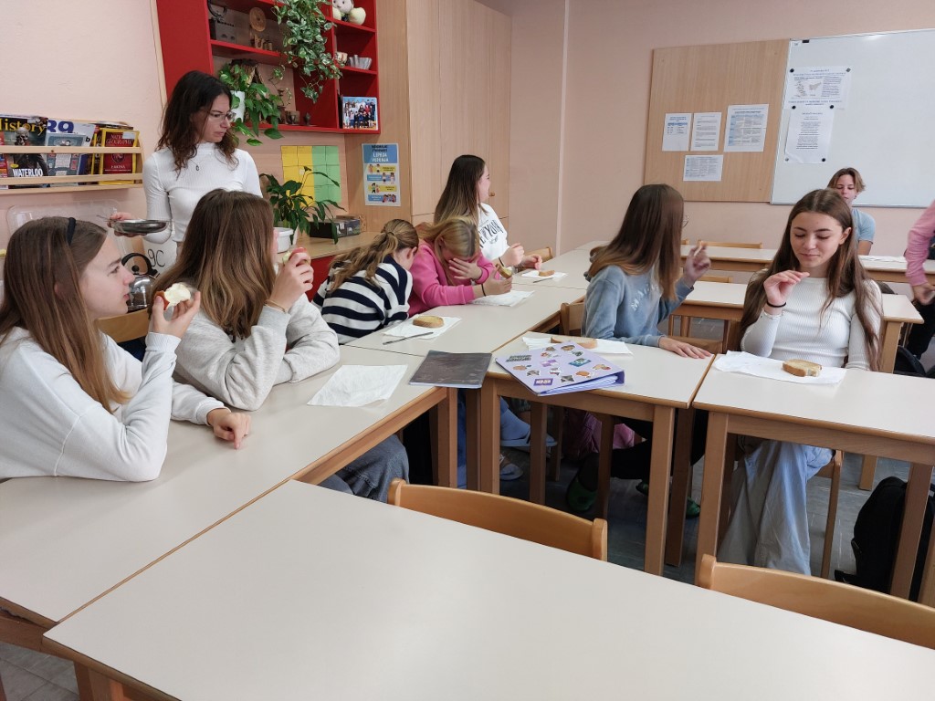 Učenci so z veseljem na črni kruh namazali slastni med in maslo ter si zraven postregli še mleko in jabolko.